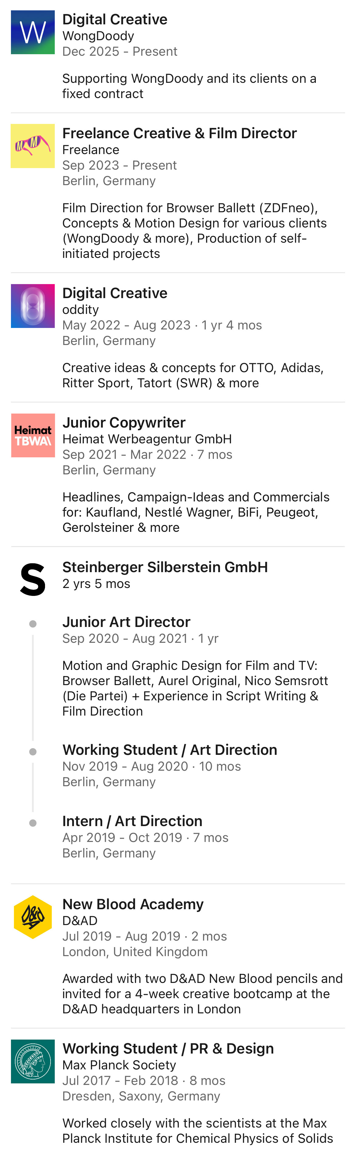 Hello world, my name is Manuel. I’m a Concept Creative & Film Director, based in Berlin. Over the years, I’ve worked in different creative roles (see CV below) and gathered experience in professional film production with a strong focus on comedy / satire as well as advertising. My skills range from copywriting to design and film direction. So hit me up if you are in need of creativity (or just wanna chat). Cheers!